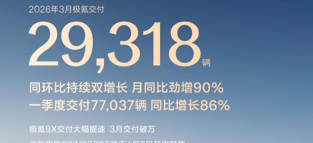极氪延续豪华新能源增速标杆表现,3 月交付 29318 辆,同比增长 90%,一季度累计交付 77037 辆,同比增长 86%。极氪 9X 单月交付破万,成为增长核心引擎,45 万元级极氪 8X 将于 4 月中旬上市,持续扩容产品矩阵,巩固高端市场地位。