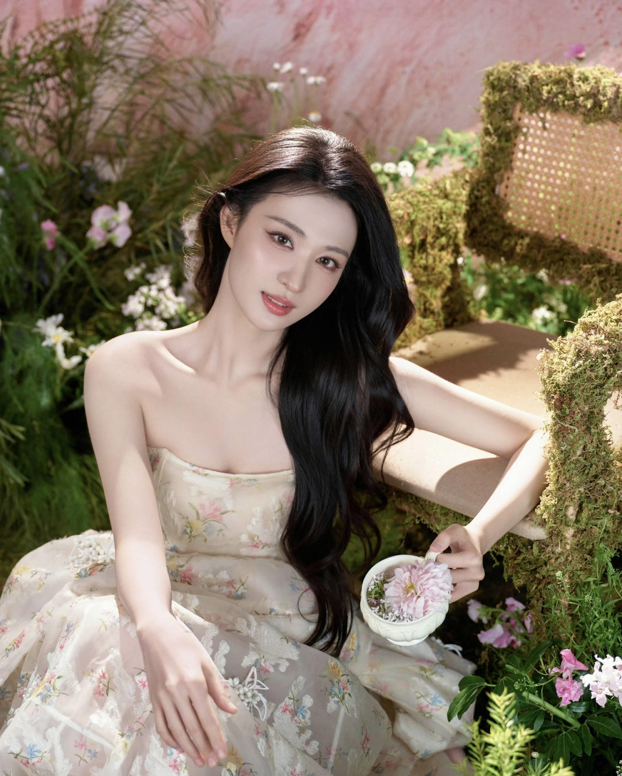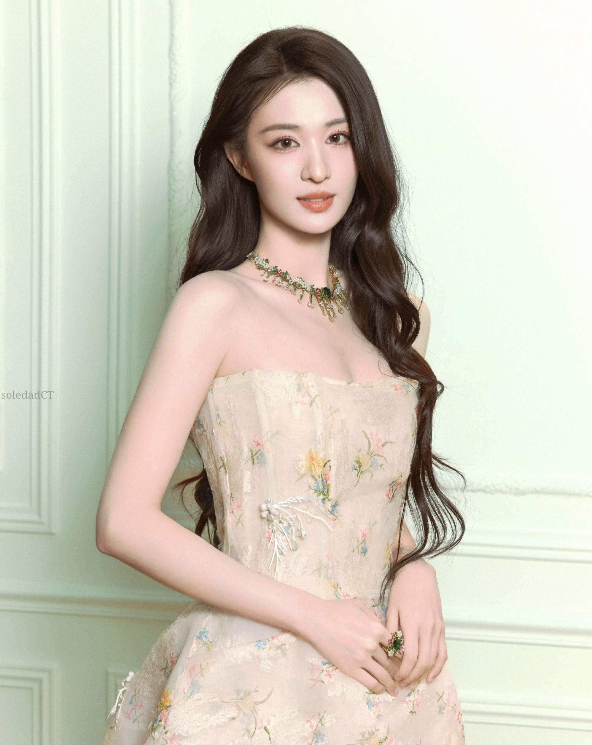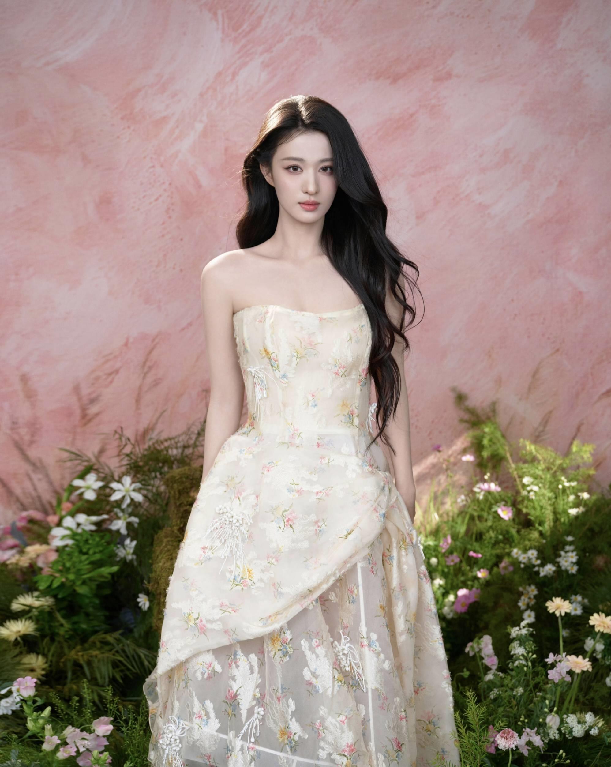 作为95后小花中少有的“无考察期空降”大使,她身上的东方古典韵味与品牌的审美高度契合。此次苏州之行,团队并没有选择夸张繁复的堆砌,而是利用了“人景合一”的策略。王楚然身着的抹胸花朵礼服,设计简约而精致,立体的花卉元素既呼应了高珠展的浪漫主题,又巧妙地勾勒出她优越的肩颈线条和精致锁骨。这种“做减法”的造型思路,恰恰是为了最大程度地凸显她本人的气质与珠宝的璀璨。